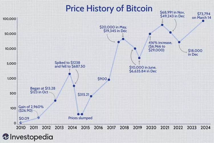 Arvonnousu: Bitcoin on historiallisesti osoittanut merkittävää arvonnousua, vaikka sen arvo on myös laskenut ajoittain rajusti.